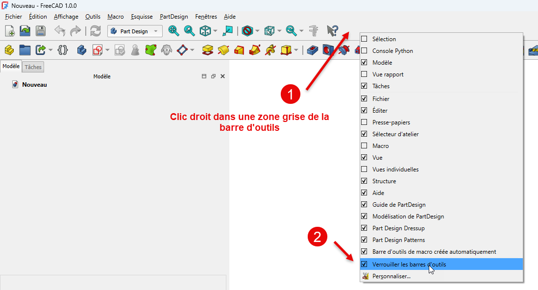 Fermer l’atelier Sketcher : FreeCAD a repositionné tous les boutons de l’atelier PartDesign