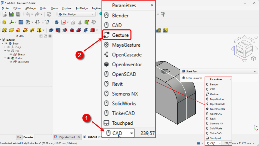 Pour naviguer visuellement dans la vue 3D et interagir avec les objets affichés, FreeCAD propose plusieurs styles ou modes de navigation à la souris. Le style par défaut est le style CAD.