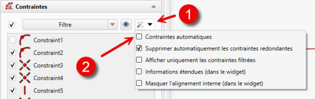 Contraintes permet d'activer / désactiver le réglage Contraintes automatiques ; Lorsque Contraintes automatiques est coché, lors de la création de nouveaux éléments géométriques (lignes, cercles…), certaines contraintes (ligne horizontale, ligne verticale, coïncidence, points sur objet…) seront ajoutées automatiquement.