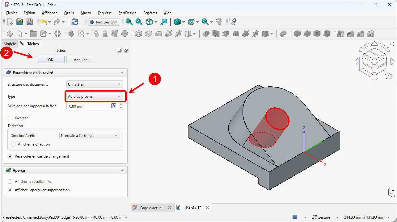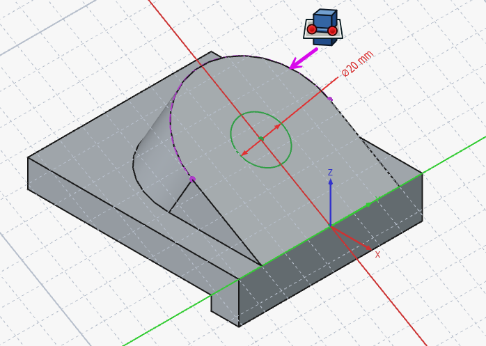Pour positionner le centre du cercle, créer une géométrie externe de construction[1] d’intersection
