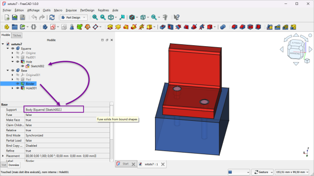 Télécharger le fichier tuto7.FCStd sur votre ordinateur et l'ouvrir dans FreeCAD ;