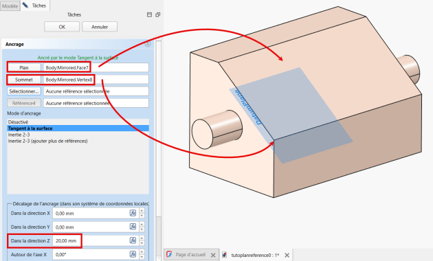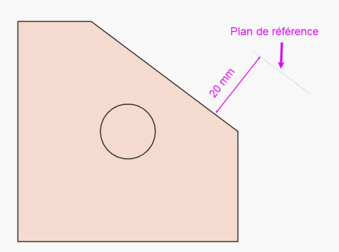 Construire un plan de référence parallèle au plan incliné distant de 20 mm et dont l’origine est placée sur le coin inférieur gauche du plan incliné ;
