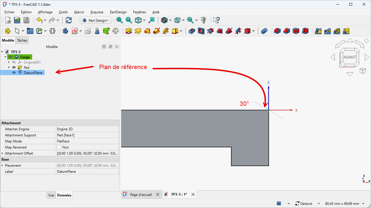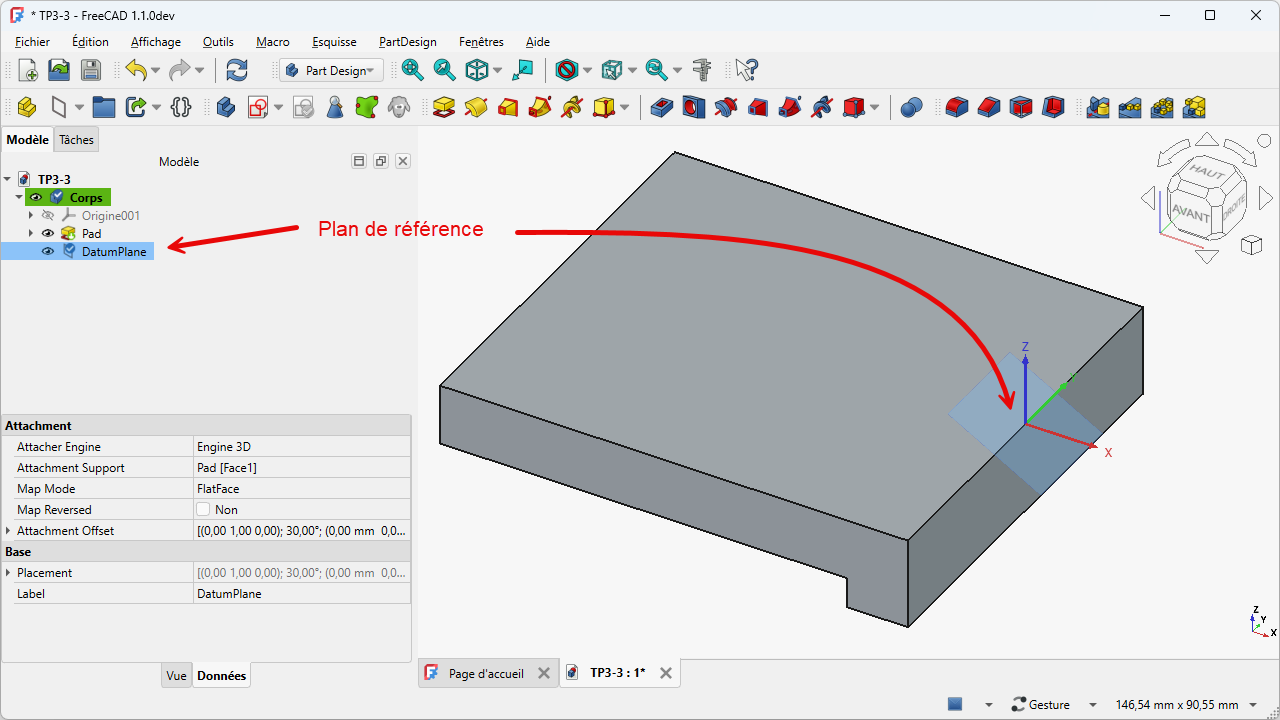Sélectionner la face supérieure du Pad et sélectionner la commande Plan de référence (cliquer sur le bouton déroulant pour accéder à la commande la 1ère fois)