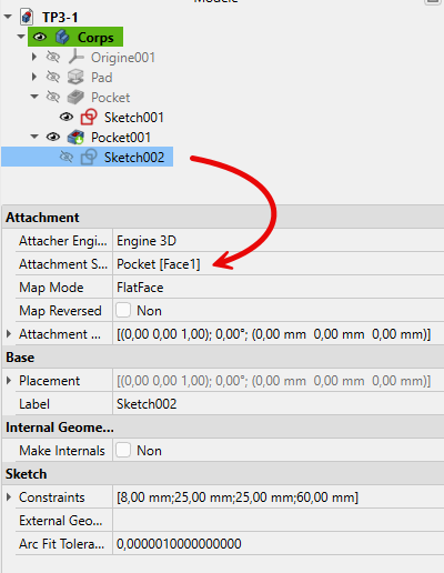 En choisissant la face horizontale pour créer l’esquisse, FreeCAD a attaché l’esquisse à cette face : Pocket [Face1] ;