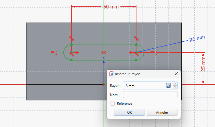 Modification du modèleGrâce à la modélisation paramétrique, il est très facile de modifier le modèle.Tâches à réaliser - Tâches à réaliser⚓Passer le rayon du trou oblong à 8 mm ;Truc & astuce - Aide⚓Dans la vue modèle, développer la branche Pocket ;Double-cliquer sur Sketch001 ;Sélection de l'esquisse à modifierDouble-cliquer sur la contrainte de rayon et modifier sa valeur à 8 mm ;Modification du rayon du trou oblong