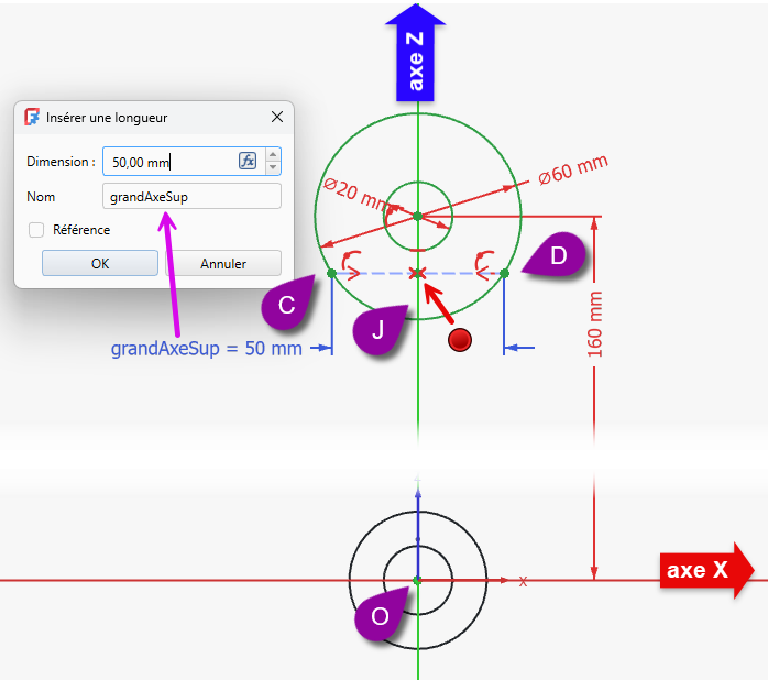 - Le point J doit être une géométrie réelle[2] pour être visible dans la vue 3D : il permettra de positionner le haut de la nervure ;