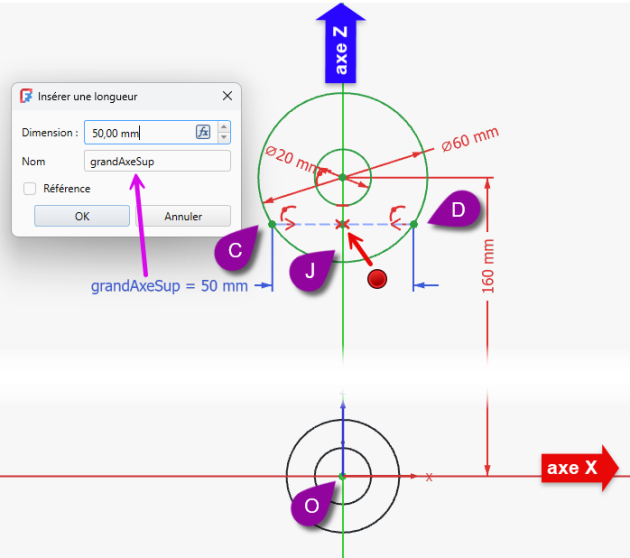 La corde CD doit être une géométrie de construction[1] pour ne pas être prise en compte lors de la création de la protrusion du cylindre ;
