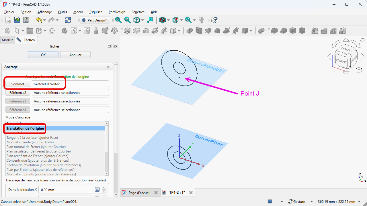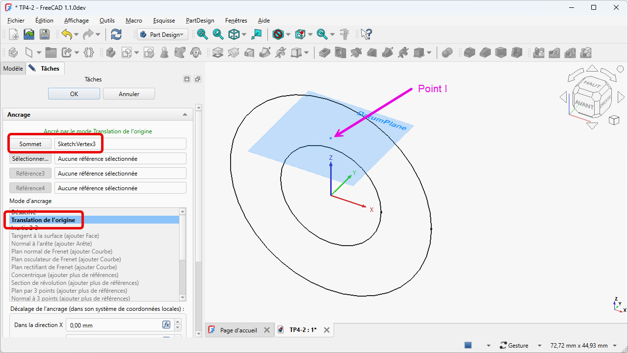 Plan des ellipsesTâches à réaliser - Plan de référence inférieur⚓Dans la vue 3D, sélectionner le point I et cliquer sur la commande Plan de référence ;Plan de référence pour le bas de la nervureRenommer ce plan PlanInf ;Truc & astuce - Aide⚓Zoomer pour visualiser et sélectionner le point I ;Cliquer sur le bouton déroulant Système de coordonnées pour accéder à la commande Plan de référence ;Tâches à réaliser - Plan de référence supérieur⚓Dans la vue 3D, sélectionner le point J et cliquer sur la commande Plan de référence Plan de référence pour le haut de la nervureRenommer ce plan PlanSup ;