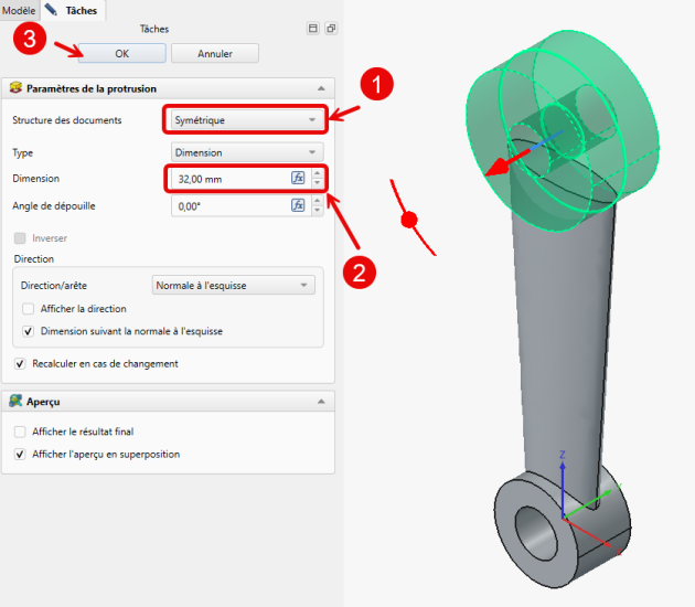 Création des cylindresTâches à réaliser - Taches à réaliser⚓Sélectionner l’esquisse CylInf et créer une protrusion symétrique de 25 mm ;Protrusion du cylindre inférieurSélectionner l’esquisse CylSup et créer une protrusion symétrique de 32 mm ;Protrusion du cylindre supérieur