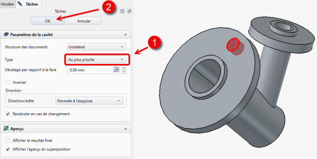 Trous sur la grande platineTâches à réaliser - Tâches à réaliser⚓Dans la vue Modèle, cliquer droit sur Corps et l'activer ;Sélectionner la face externe de la grande platine :Face à sélectionnerCréer l'esquisse ci-dessous :Esquisse à créerTâches à réaliser - Tâches à réaliser⚓Créer une cavité du type le plus proche à partir de cette esquisse ;Création de la cavité sur la grande platineCréer une répétition circulaire en sélectionnant la cavité que vous venez de créer avec 6 occurrences ;Répétition circulaire de la cavité Pocket002