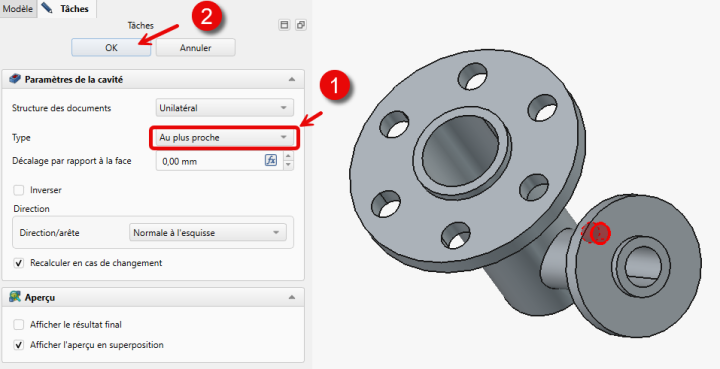 en sélectionnant la cavité créée avec 8 occurrences et en prenant la ligne de référence comme axe ;
