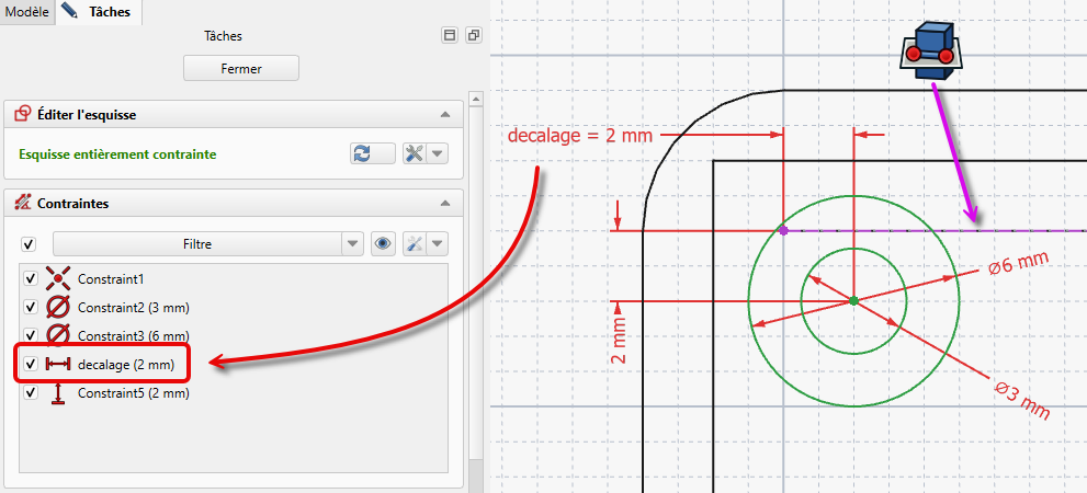 decalageà la cote horizontale de 2mmRenommer l'esquisse de