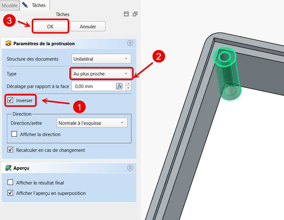 Pour ne pas avoir à saisir de dimension, la protrusion ira jusqu'à la première face rencontrée ;