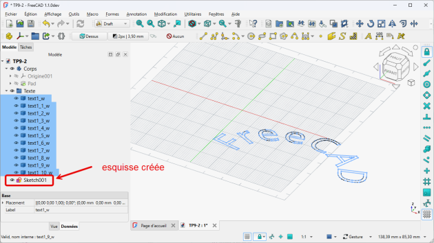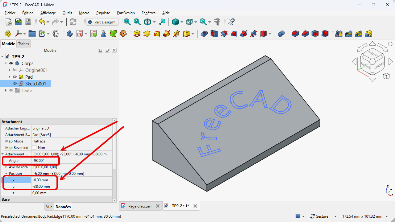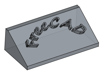 Repositionner le mot Freecad sur le plan incliné comme ci-dessous en modifiant les propriétés de l'attachement (angle et positions x & y) ;