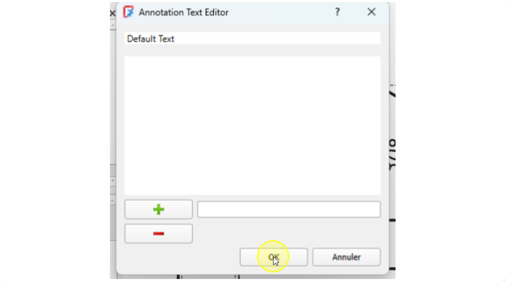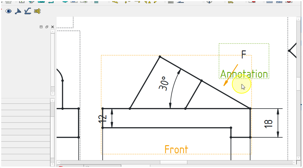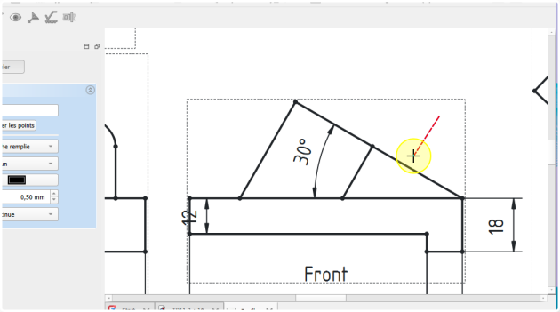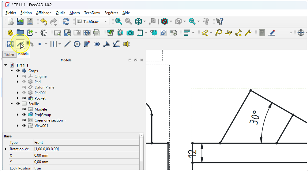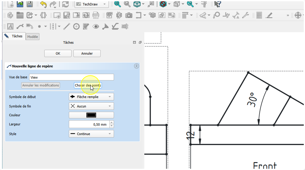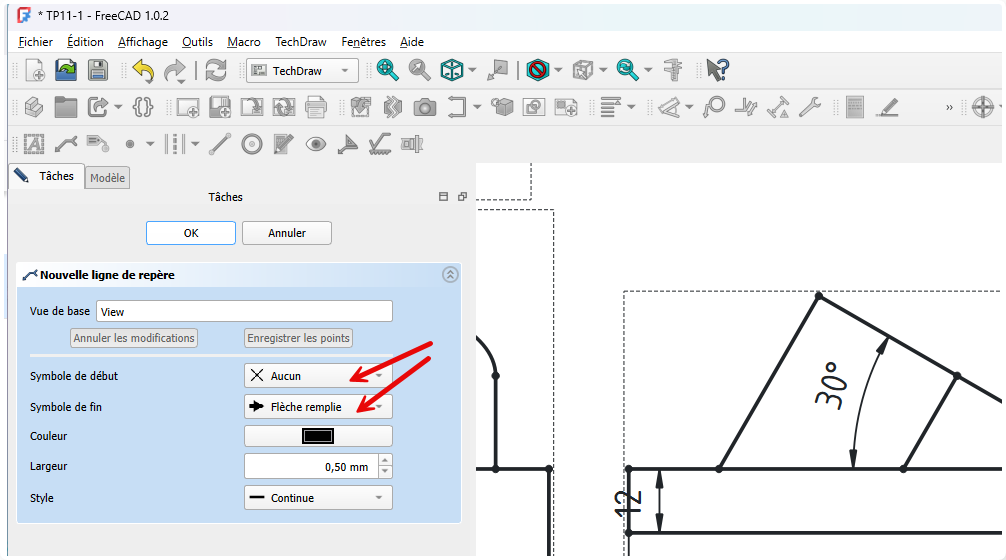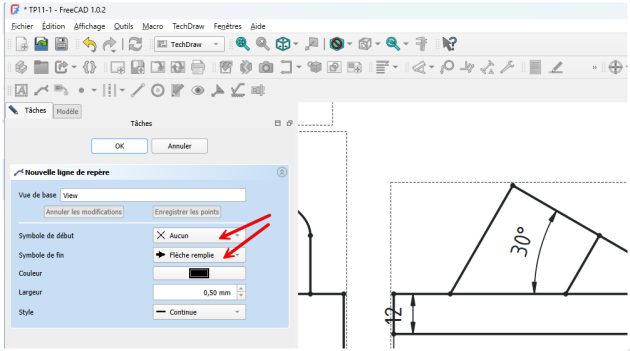Insertion de la direction pour la vue obliqueProcédure - Pour insérer la flèche montrant la direction de la projection de la vue suivant F⚓ProcédureSélectionner la vue de face⚓Sélection de la vueCliquer sur la commande Ajouter une ligne de repère à la vue ;⚓Sélectionner la commande Ligne de repèreCliquer sur le bouton choisir des points ;⚓Cliquer sur le bouton Choisir des pointsCliquer gauche pour saisir le premier point et double-cliquer gauche pour saisir le deuxième point de la flèche et clôturer la saisie ;⚓Saisir les points du repèreSi la flèche reste horizontaleModifier les préférences de l’atelier TechDraw :Désactiver Ligne de repère horizontale automatiqueSi nécessaire ajuster le symbole de début et de fin ;⚓Ajuster les symboles de début et de finValider⚓Insertion de la flècheProcédure - Pour insérer la lettre F⚓ProcédureCliquer le sur bouton Insérer une annotation ;⚓Cliquer sur la commande AnnotationDouble cliquer sur l’annotation ;⚓Édition de l’annotationModification de l’annotation et valider⚓Positionner l’annotation ;⚓Positionner la lettre F